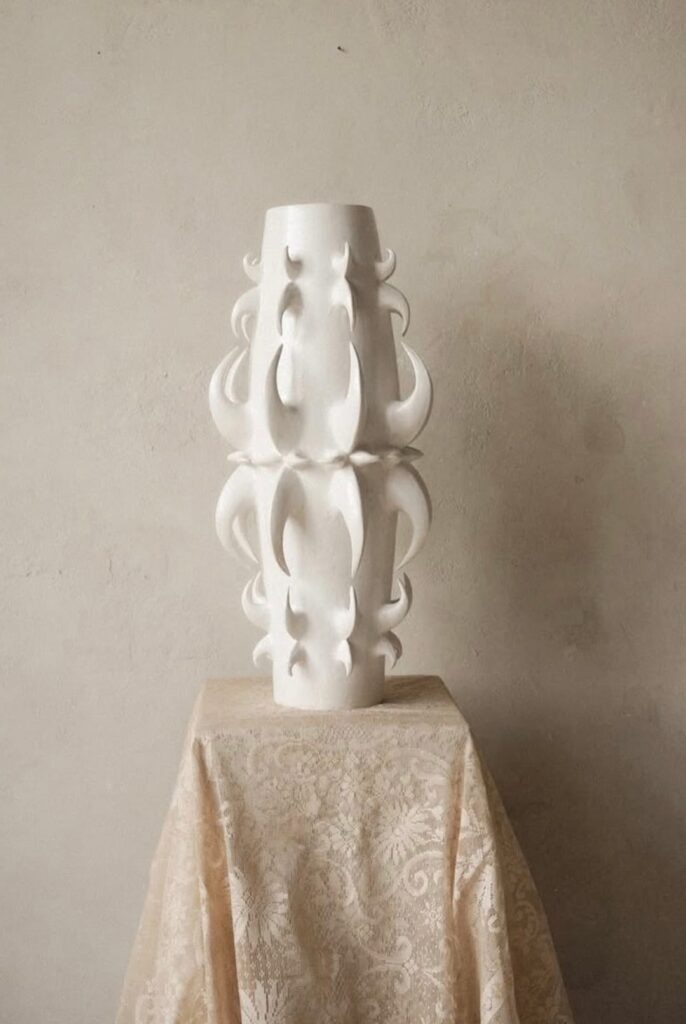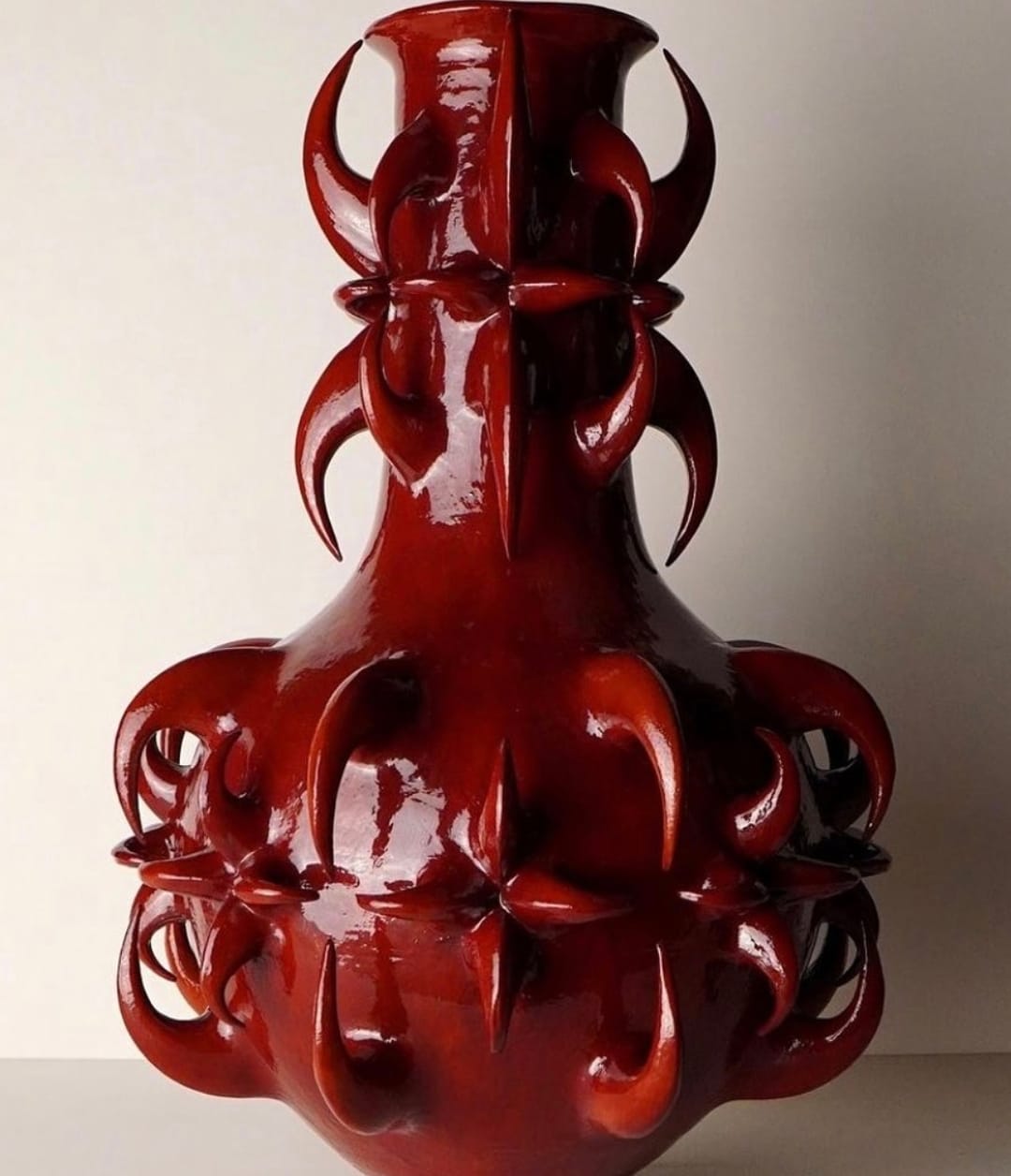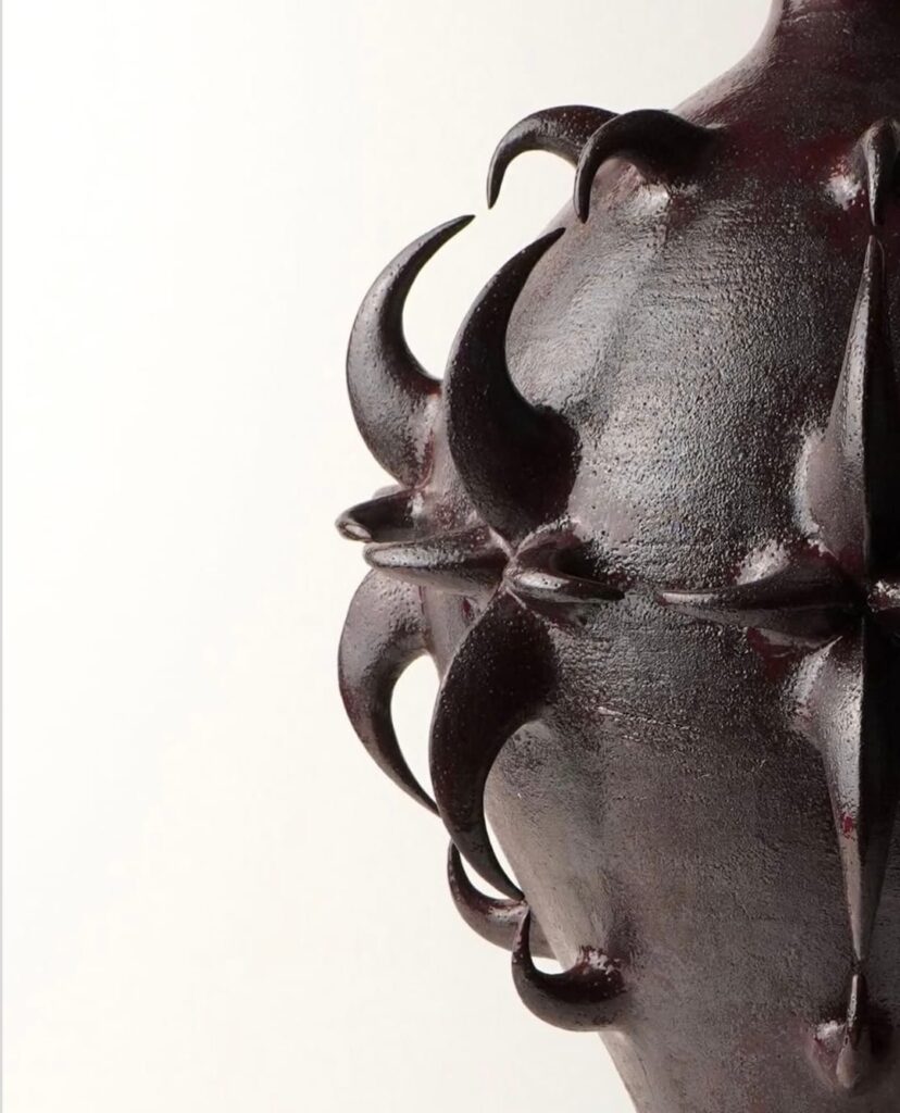 En NJH, las protuberancias agudas no funcionan como adorno. Son una piel protectora que encierra y, a la vez, exhibe vulnerabilidad. Las obras se leen como organismos: recipientes que parecen respirar, tensarse o cerrarse, como si fueran refugio y armadura al mismo tiempo. La superficie, cargada de relieve, hace que la pieza cambie según la luz y el punto de vista: por momentos se vuelve amenazante; por momentos, íntima, casi frágil. Esa ambivalencia está buscada: su lenguaje visual trabaja la fricción entre belleza y brutalidad, fuerza y sensibilidad, defensa y exposición.